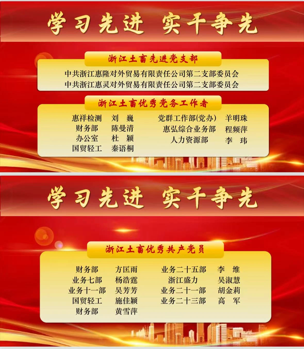 為弘揚先進、樹立標桿,激勵公司各黨支部和廣大黨員見賢思齊、奮勇爭先,浙江土畜黨委決定,對公司先進黨支部、優秀共產黨員和優秀黨務工作者予以表彰。希望公司各黨支部和全體共產黨員,要以受到表彰的先進典型為榜樣,學習他們堅守信仰、對黨忠誠的政治本色,學習他們開拓市場、服務大局的闖關精神,學習他們深耕主業、精益求精的務實作風,學習他們遵規守紀、清正廉潔的職業操守。要大力傳承和發揚土畜人“實干”的優良傳統,將榜樣的力量轉化為攻堅克難、再創佳績的強大動力,為奮力譜寫浙江土畜高質量發展新篇章展現更大作為,貢獻更多智慧和力量。
