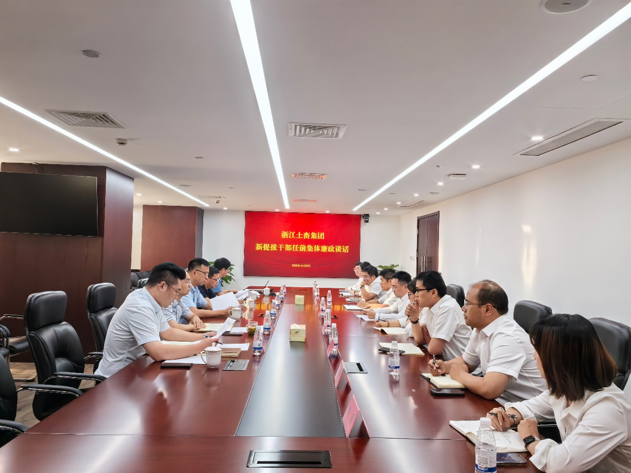 10月9日下午,浙江土畜召開新提拔干部任前集體廉政談話會議。公司黨委書記、董事長張斌,黨委副書記、總經理林軍,黨委副書記金彤,紀委書記李峰出席會議并講話。公司人力資源部、紀律檢查室相關人員和全體新提拔干部參加會議。