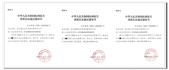 日前,公司下屬浙江惠元對外貿易有限責任公司、浙江惠靈對外貿易有限責任公司、浙江惠隆對外貿易有限責任公司收到了杭州海關簽發的《重新認證通過通知書》,成為今年杭州關區首批通過AEO高級認證重新認證的企業。